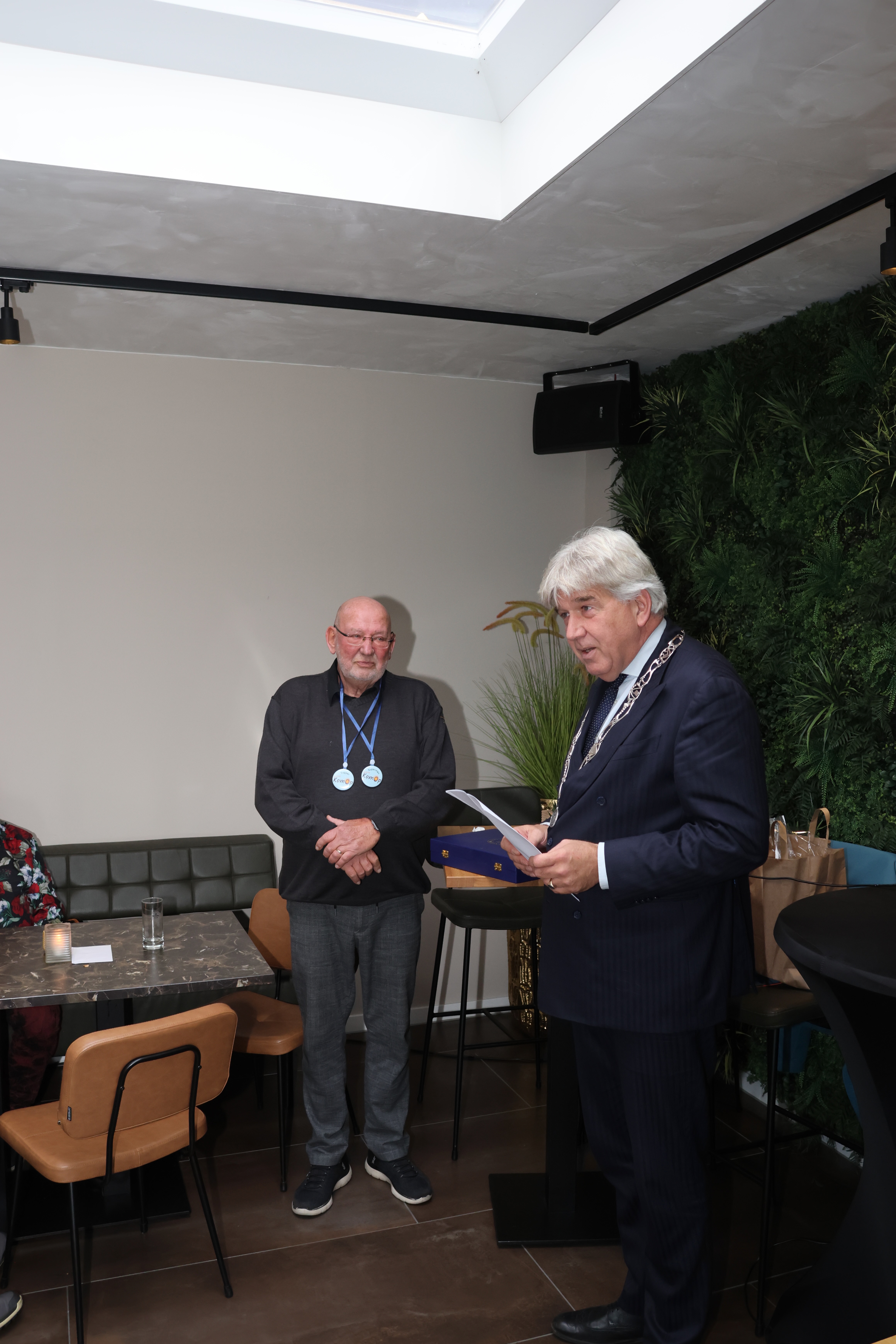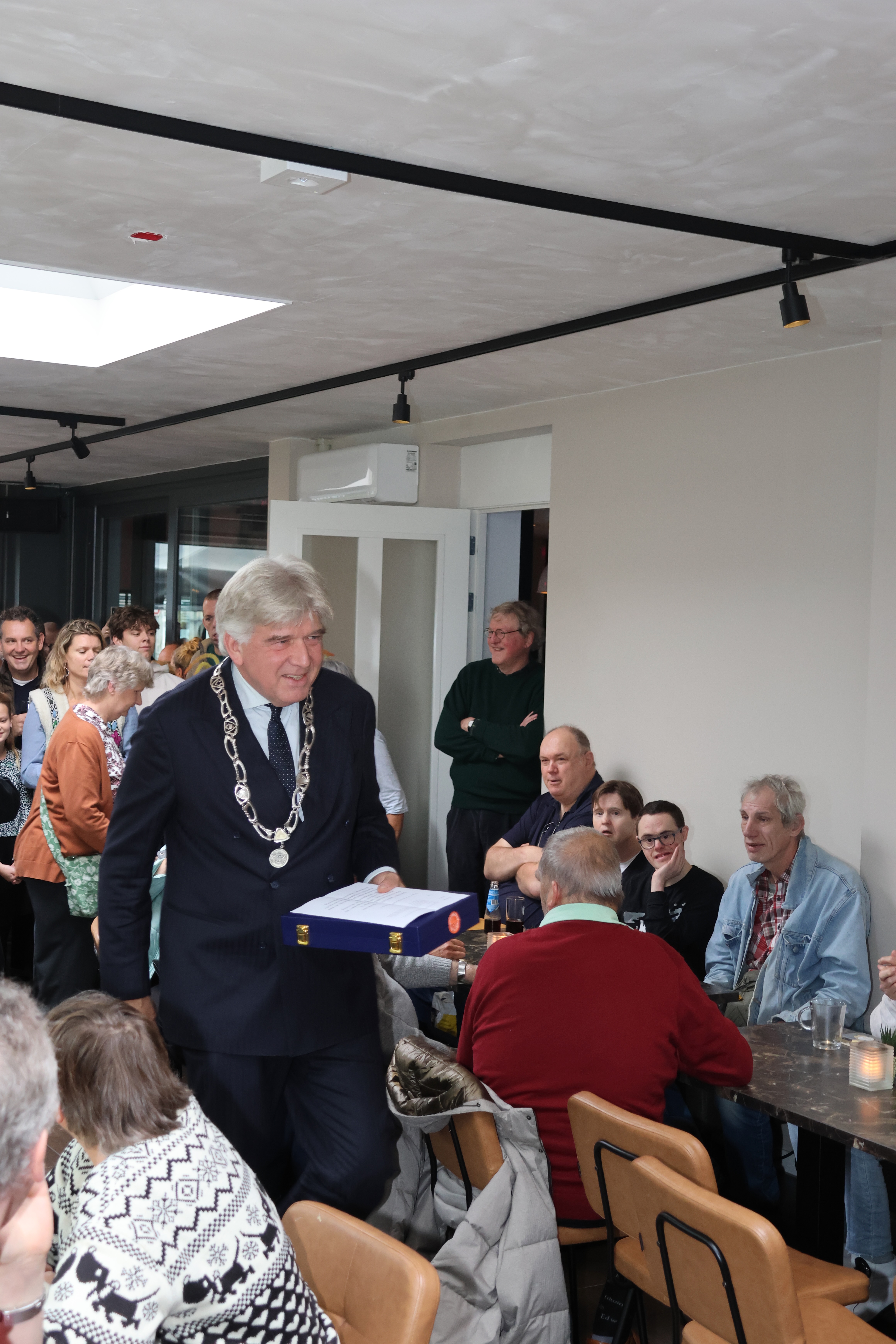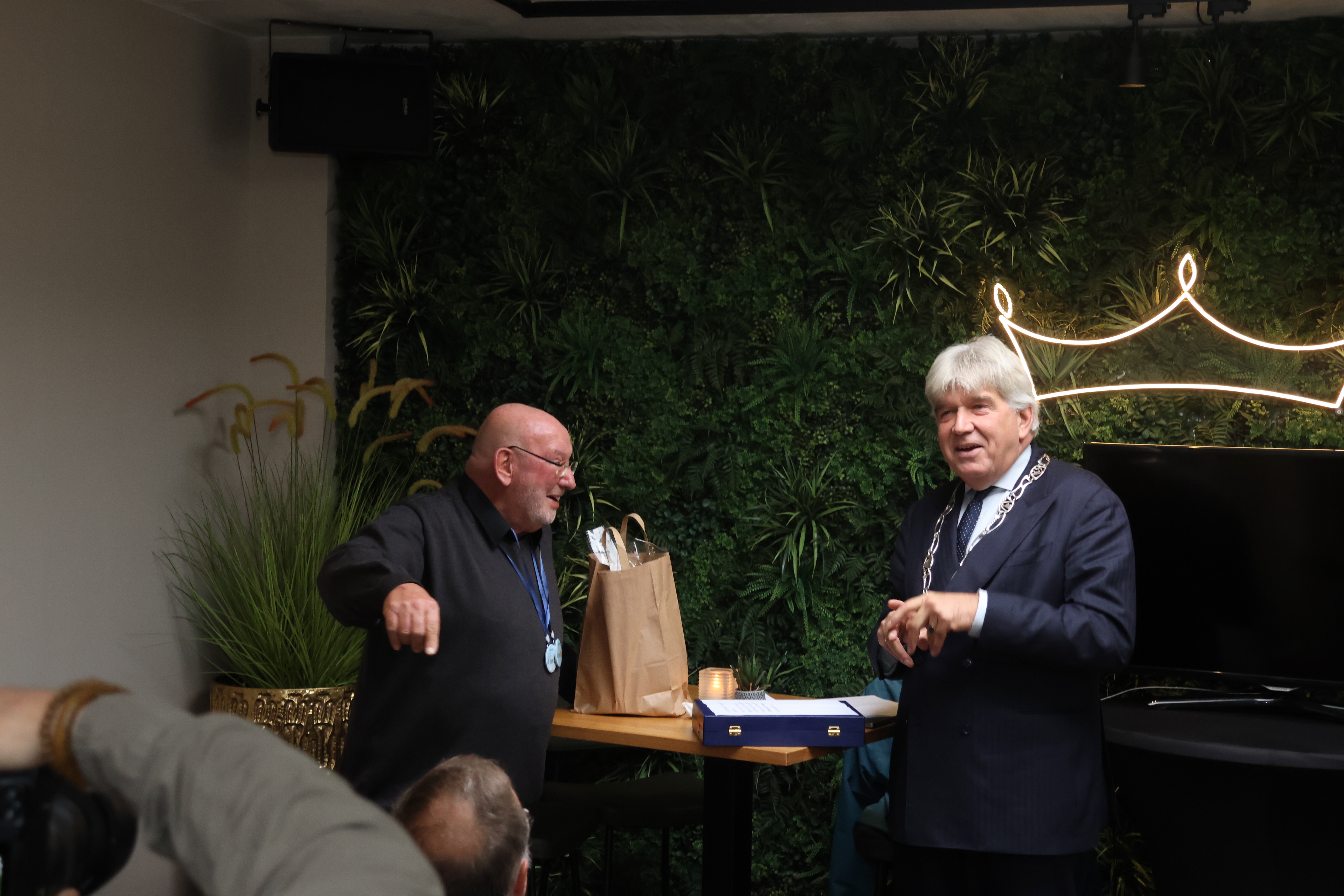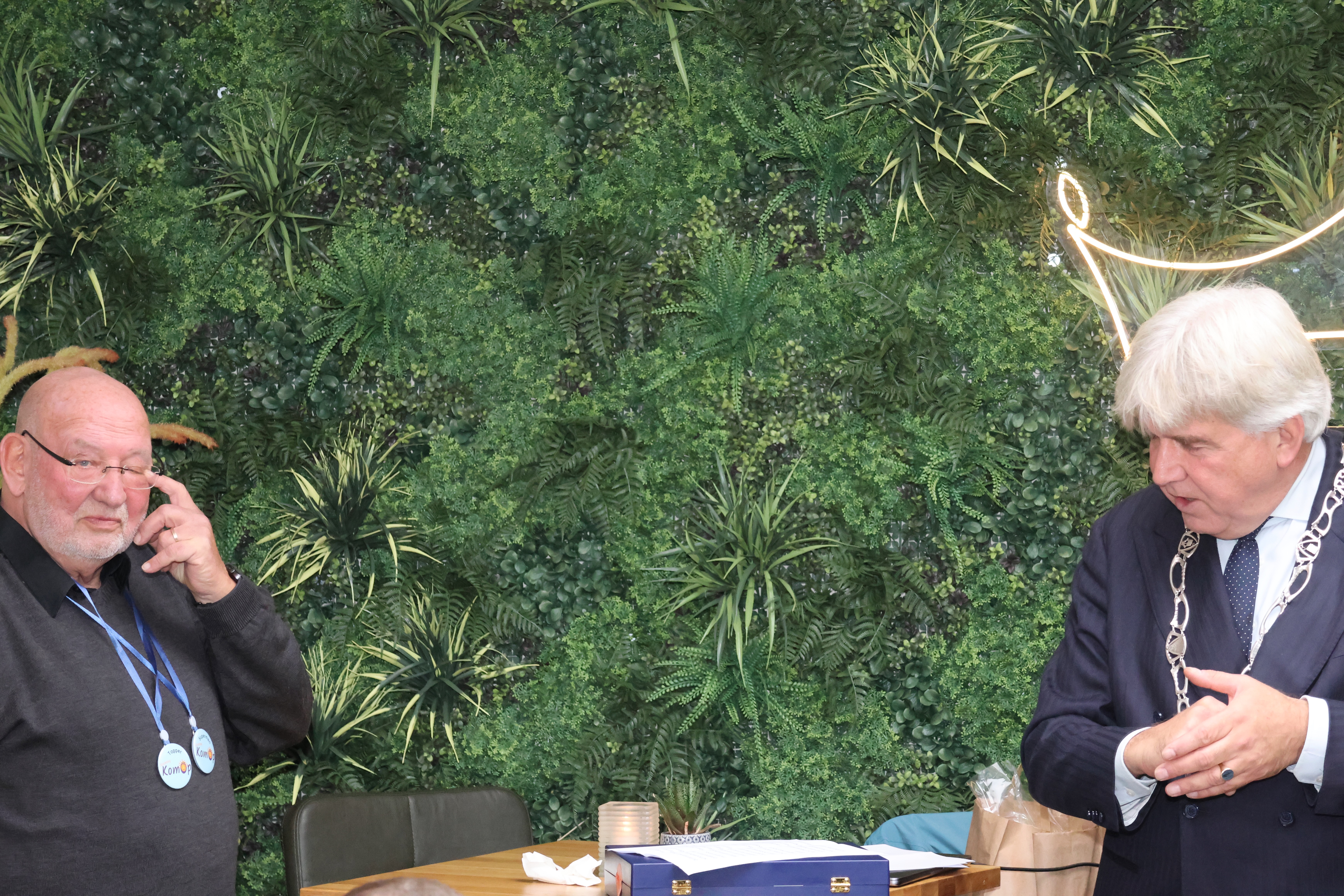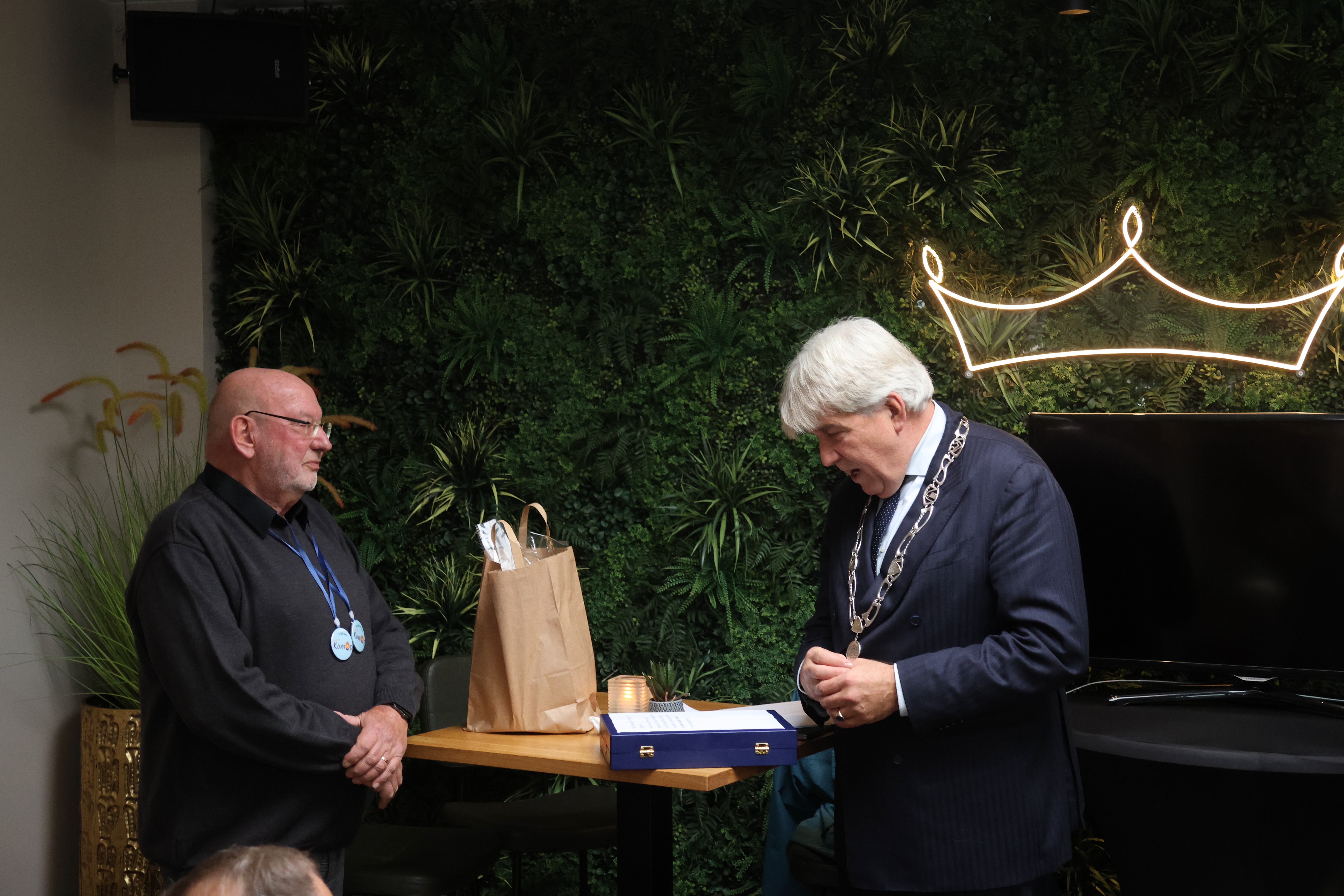 Na een korte toespraak van de burgemeester kreeg Jan de onderscheiding opgespeld.